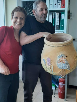 משפחת אטקין הגיעה אלי לחגוג יום הולדת לאם המשפחה. הם הביאו איתם כד גדול ליצירה. הוחלט במקום על יצירה ספונטנית של ציפור אדום החזה. הילדים המוכשרים ציירו את הדוגמה על הכד והתחלנו לעבוד.